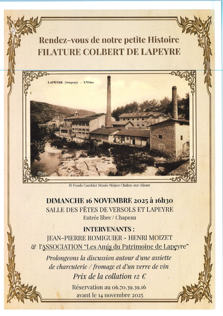 Conférence sur la filature Colbert de Lapeyre : Rendez-vous à la salle des fêtes de Versols et Lapeyre dimanche 16 novembre 2025 à 16h30