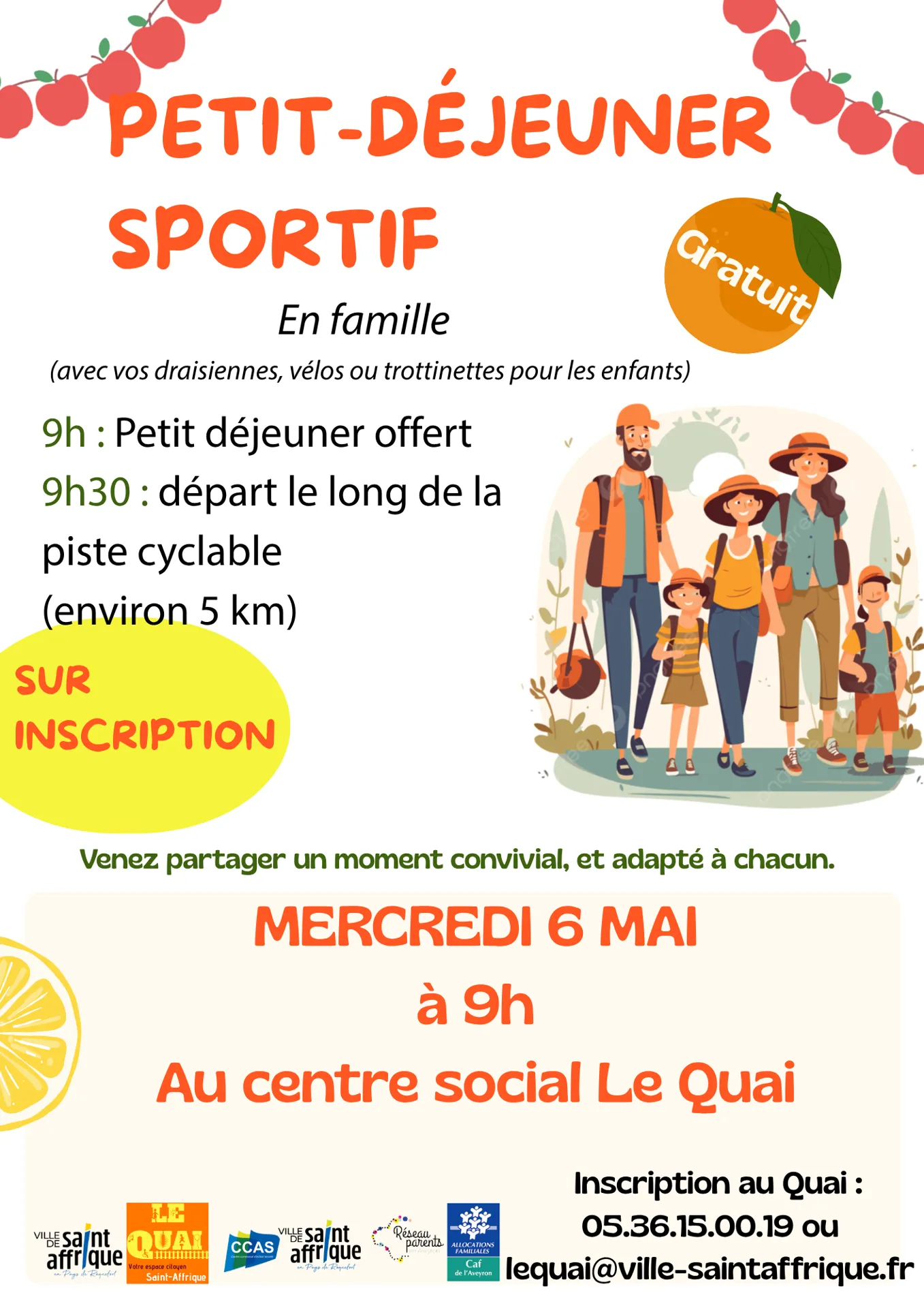 le CCAS et le centre social invitent les familles à un petit-déjeuner sportif convivial. Rendez-vous au centre social pour un petit-déjeuner offert, avant un départ à 9h30 pour une balade d’environ 5 km le long de la piste cyclable.